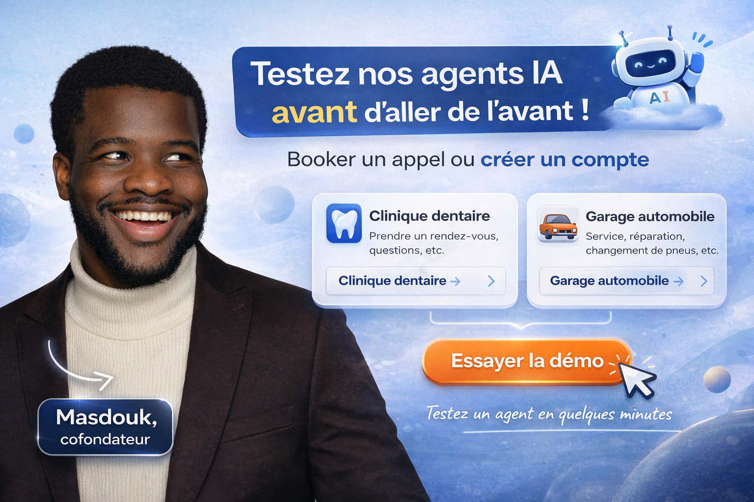 Rejoignez les entreprises qui automatisent leurs communications avec notre agent vocal IA. Configuré par nous afin de s'adapter avec votre demande spécifique.